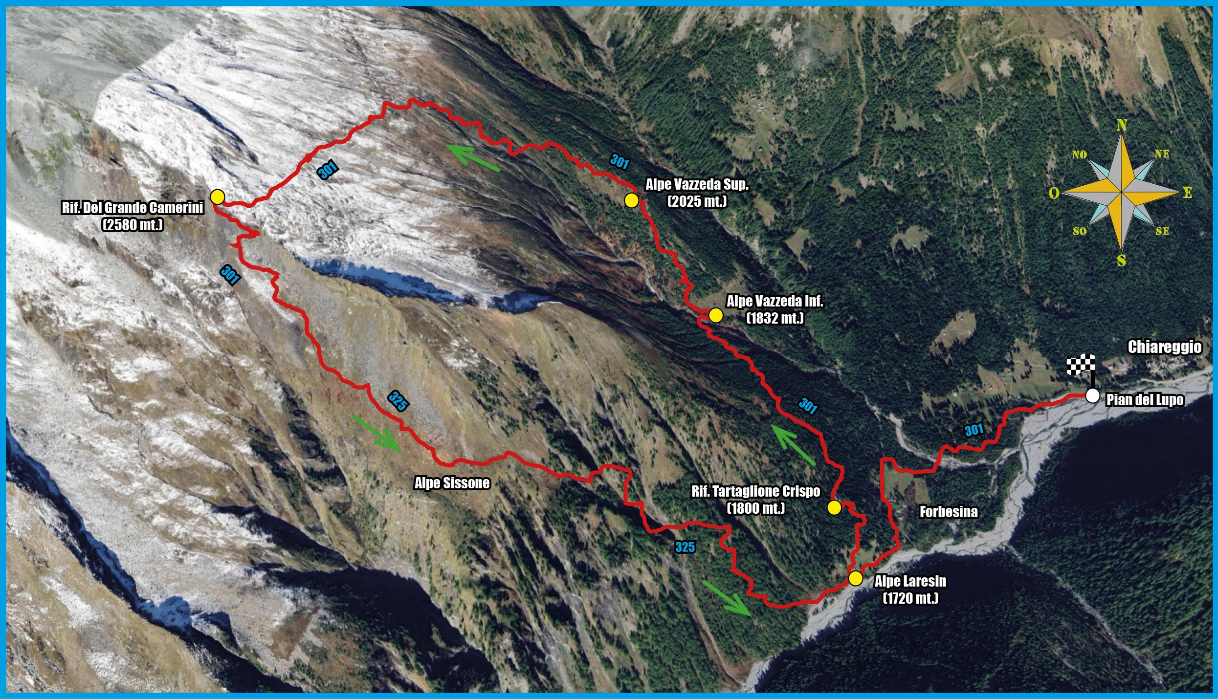 Tappe del percorso: Chiareggio (Pian del Lupo) - Forbesina - Alpe Laresin - Rif. Tartaglione Crispo - Pian dei Vitelli - Alpe Vazzeda Inferiore - Alpe Vazzeda Superiore - Rifugio Del Grande Camerini - Alpe Sissone - Alpe Laresin - Forbesina - Chiareggio (Pian del Lupo)