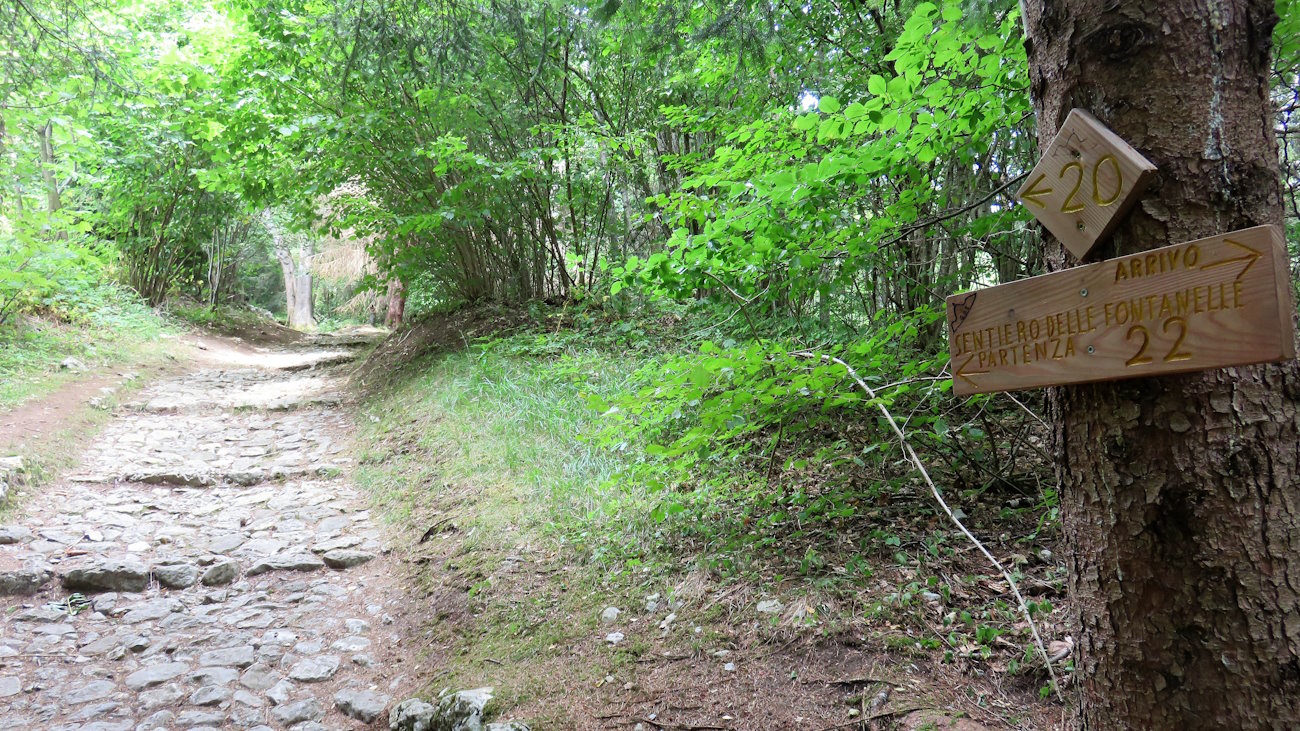 Superati i primi metri, mi dirigo verso il bosco dove cominciano i primi gradini. Dopo qualche passo arrivo ad un bivio nel quale un cartello appeso ad un albero indica i sentiero n° 20 (sx) e n° 22 (dx). Le cartine topografiche non riportano questa numerazione; in ogni caso io procedo in senso antiorario, quindi verso destra.