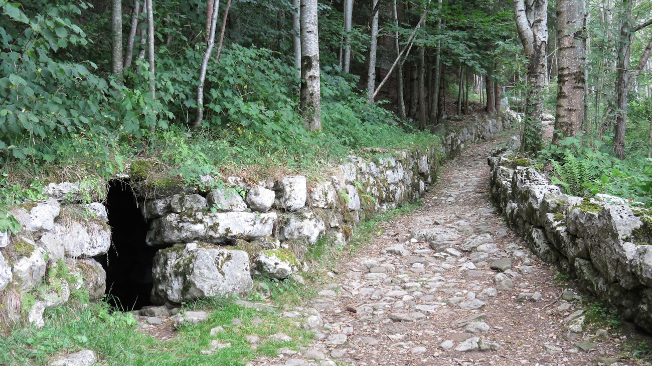 Continuando a salire arrivo ad un piccolo spiazzo in cui è posta una panchina sotto alcuni rami frondosi, dopodiché il sentiero si restringe un po’ e, sempre selciato, imbocca la direzione della prima contrada di Tonezza. Già solo camminando per questo breve tratto iniziale si può immaginare la vita degli abitanti di una volta quando si alzavano la mattina presto per curare il bestiame e sbrigare tutte le faccende connesse all’allevamento, per poi discendere verso il centro del paese, assolvere le funzioni religiose, chiacchierare con i compaesani e far ritorno alle abitazioni solo verso sera. Ad occuparsi della pulizia e della manutenzione dei sentieri una volta era la figura comunale dell’ingrossatore.