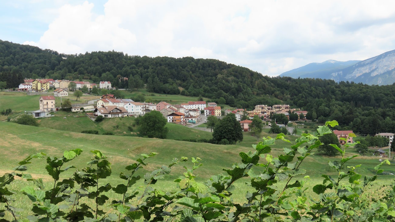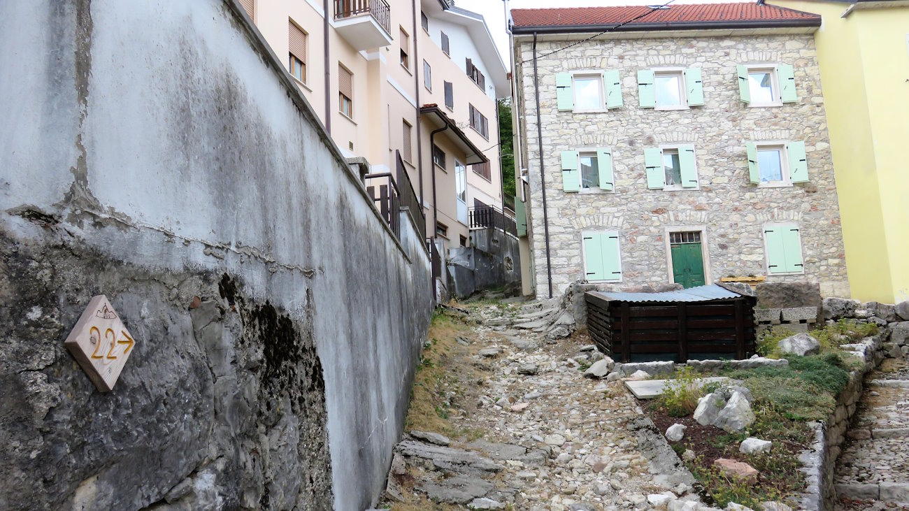 Superate le prime case guardo a sinistra dove su un muro di sostegno è presente l’inconfondibile cartello col n° 22 indicante la prosecuzione dell’itinerario. Ci metto qualche minuto a capire dove andare: l’indicazione in paese forse potrebbe essere più visibile. Un tratto un po’ strano costringe a passare in un carrugio tra le case fino a sbucare sulla strada asfaltata che va attraversata. Di fronte il sentiero riprende a salire in campo aperto, regalando una bellissima vista verso destra sulle Contrà Fontana e Grotti, immerse nei pascoli. Più oltre, il Monte Campolongo mentre alle spalle la visuale è su quel mare verdeggiante che risponde al nome di Altopiano di Asiago.