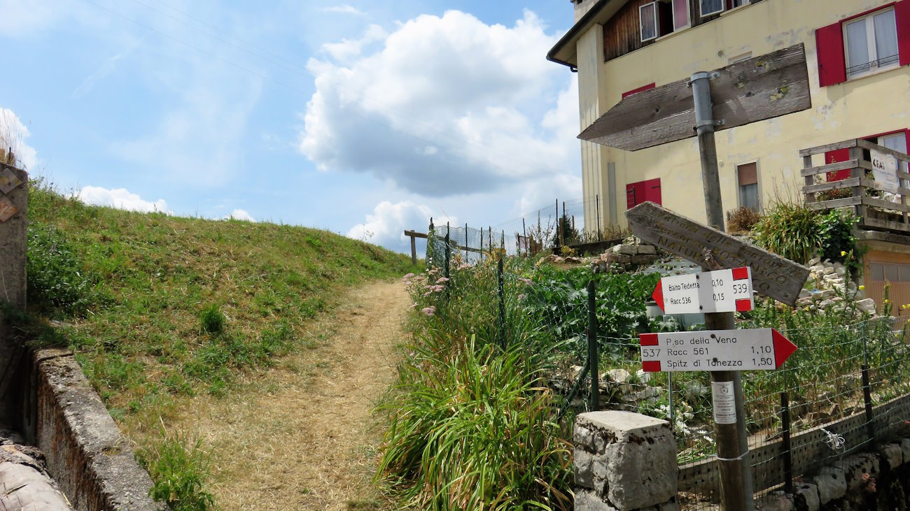 E’ molto suggestivo percorrere questo tratto in piano (anzi, in leggera discesa) con la magnifica vista sulla Valle dei Ciliegi, nella quale prati, alberi e casolari isolati formano una tela di colori da incorniciare e imprimere nella mente. Qui il panorama sulle cime soprastanti è davvero qualcosa di super. Spitz Tonezza, Toraro, Melignone, Campomolon, Valbona: ci sono tutte le principali cime che sono state interessate dalla storia.
