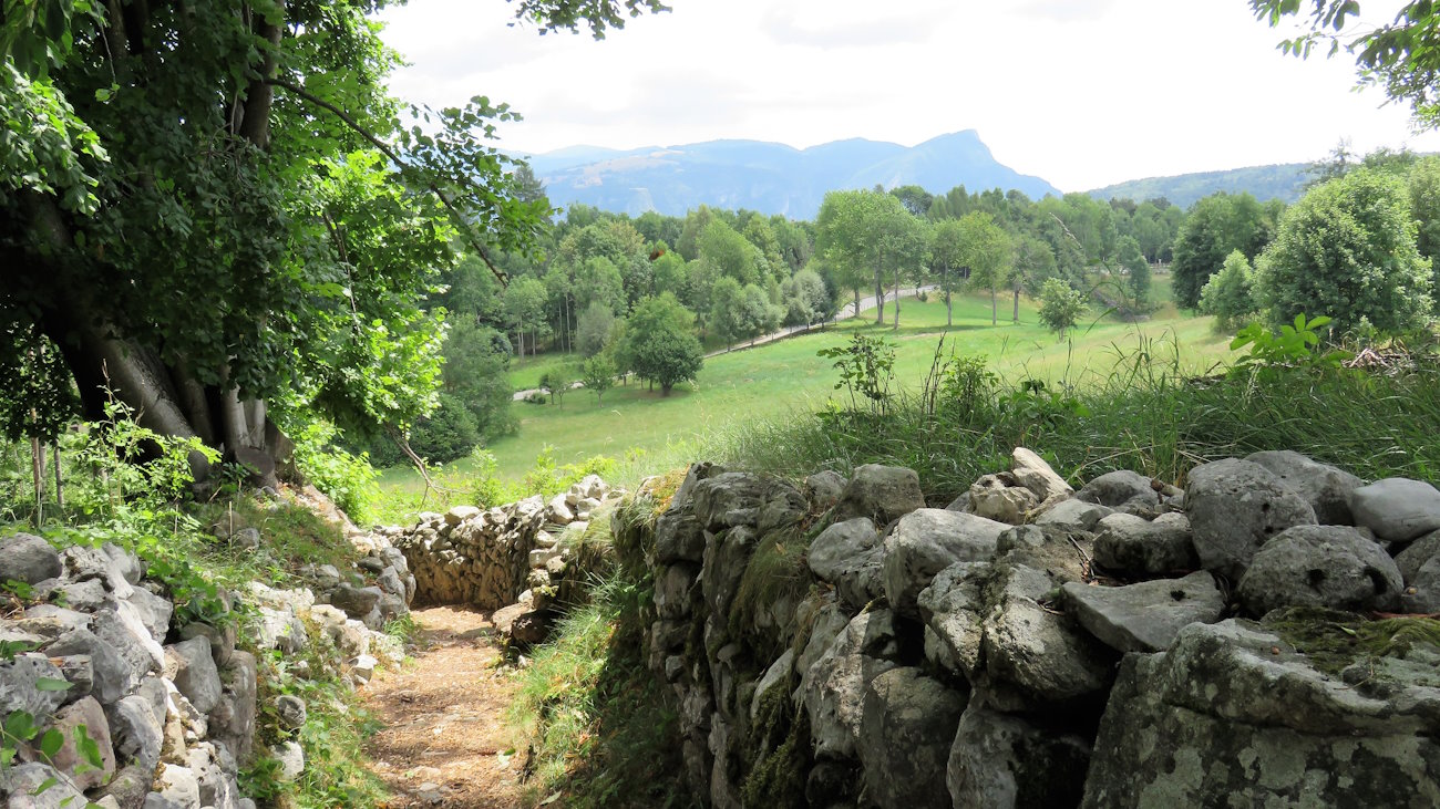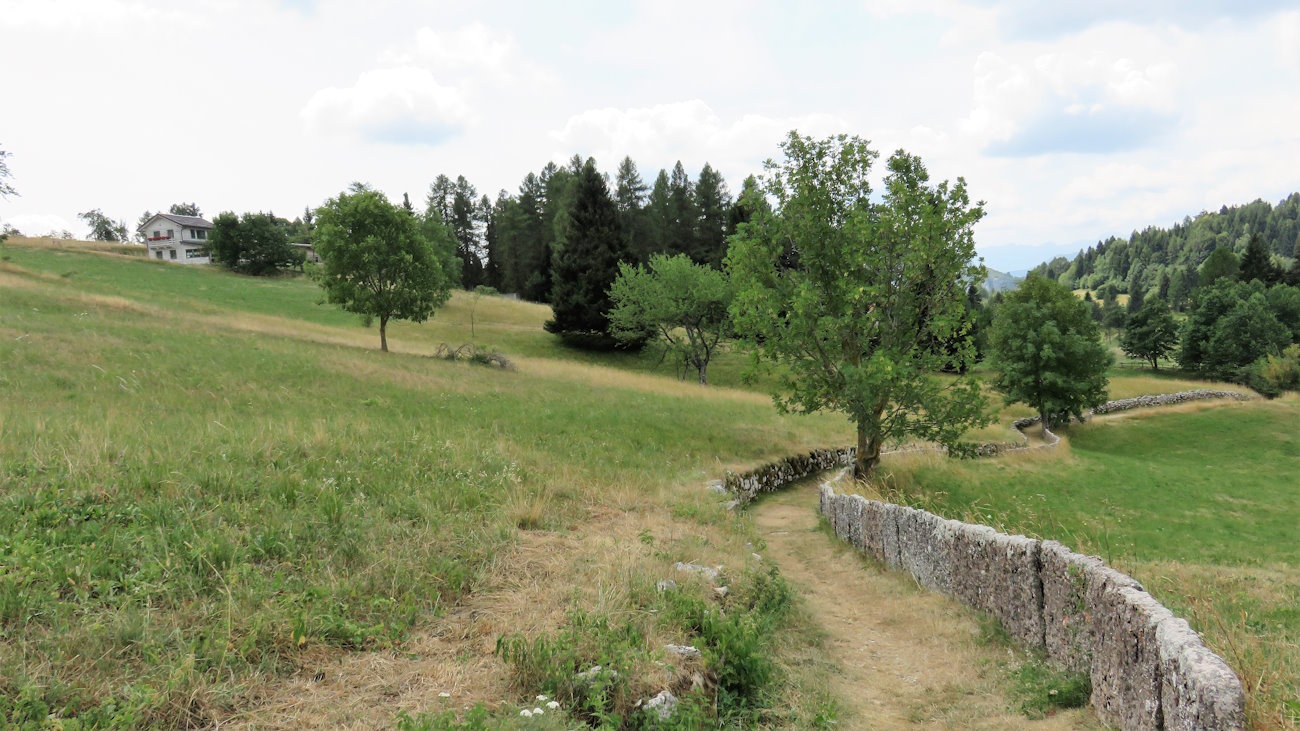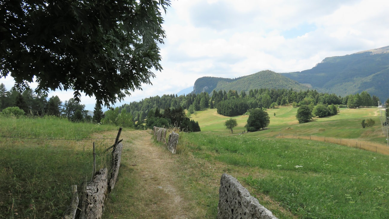 Resterei a lungo su questa panchina a contemplare l’orizzonte, senza alcuna fretta di concludere questo giro, se non fosse per il sole a picco che dopo un po’ inizia ad arrossarmi la pelle. Non volendo finire nel menù di qualche ristorante in qualità di gambero mi rimetto in marcia alla ricerca di un luogo più fresco. Attraverso quindi l’incrocio di Contrà Sella e riprendo il sentiero sulla sinistra (indicazioni n° 22 e poi n° 539) che mi porta in mezzo ad un oceano verde di prati e pascoli solcato solo da qualche sentierucolo davvero caratteristico; uno è il mio, quello che sto seguendo, delimitato qui dalle caratteristiche prie, ossia lastre di pietra, e muretti a secco. In realtà di questi percorsi tra le prie ve ne sono numerosi, come numerose sono le diramazioni che si possono imboccare.