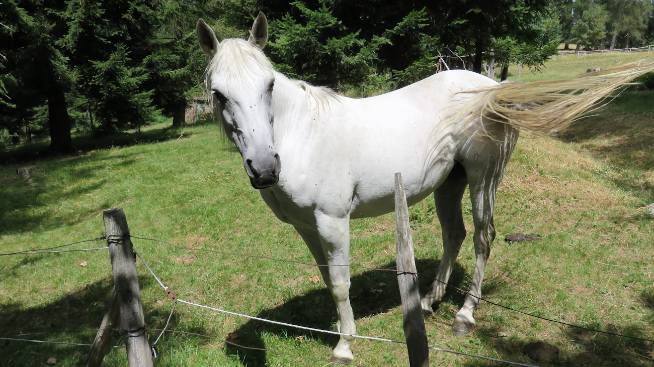 Risalgo pochissimo dislivello passando a fianco ad alcuni cavalli intenti a pascolare. Uno di loro, incuriosito dalla mia presenza, si avvicina per un saluto, ma il vero motivo credo sia la ricerca di altra erbetta fresca. E’ un bellissimo cavallo bianco che resta lì con me per un po’ prima di congedarsi e tornare al suo pranzo. In questi enormi spazi aperti gli animali possono pascolare in tutta libertà, godendo sempre di aria e cibo genuino, non trattato con sostanze che ormai avvelenano il mondo. Un piccolo paradiso per loro che sono ancora fortunati.