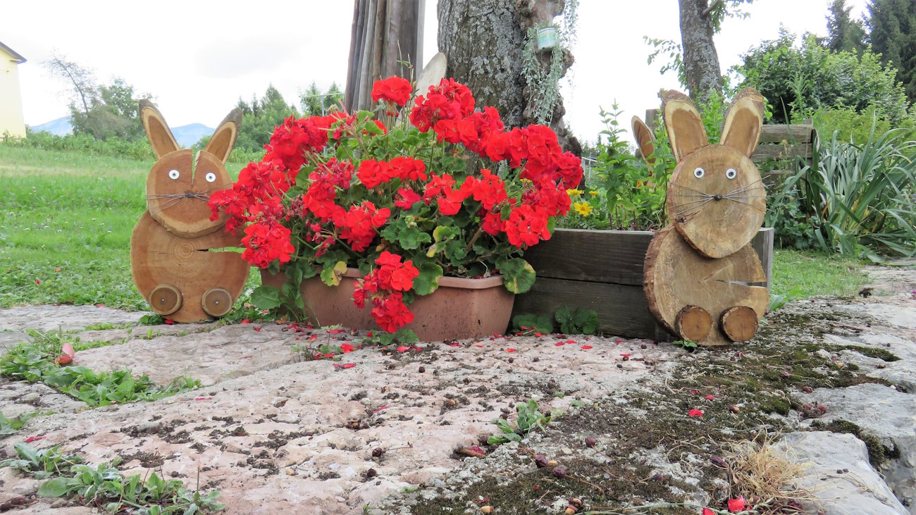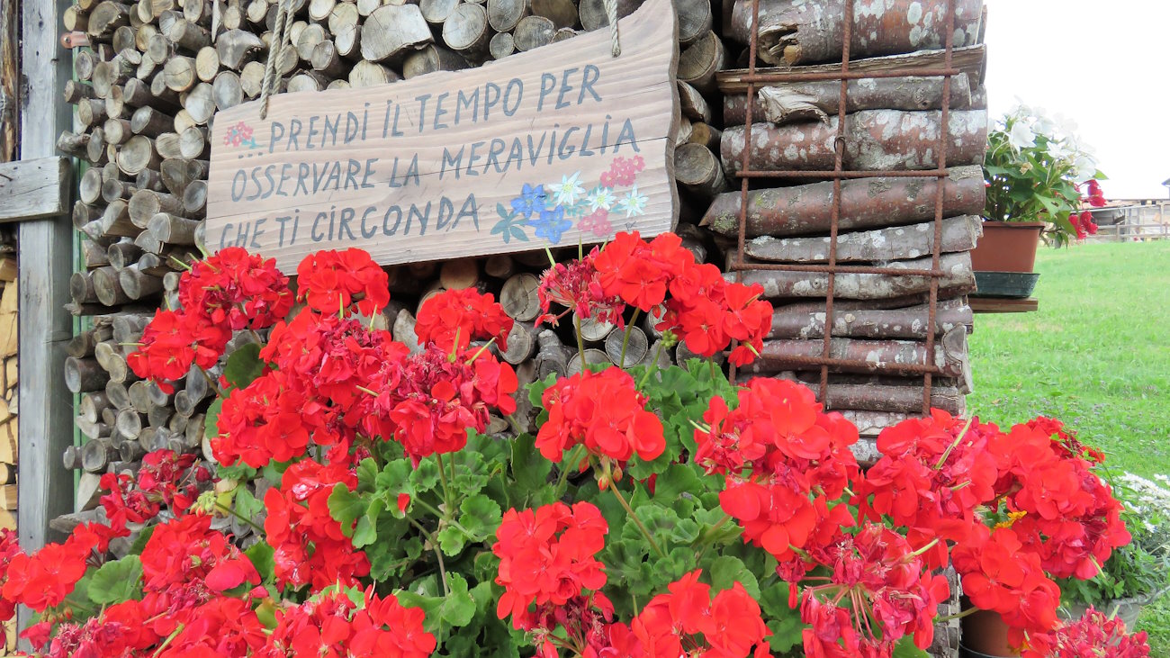 Il bel sentiero tra le mura a secco mi porta a Contrà Pettinà dove anche stavolta c’è la strada (deserta) da attraversare. Poche case, alcune moderne, altre più antiche fanno da contorno ad un altro scenario da cartolina, cosparso di alberi da frutto, orti, prati e, poco più a destra e in basso, bosco. Seguo le prie ignorando una prima deviazione sulla destra. Continuando dritto arrivo a lambire orti e giardini molto curati e pieni di fiori. Un cartello appeso ad una baracca di legno cattura la mia attenzione e la frase incisa rappresenta proprio lo scopo del percorrere questo tipo di sentieri e dell’andar per monti: “…prendi il tempo per osservare la meraviglia che ti circonda”. In mezzo a gerani fioriti e fioriere, spuntano buffi gattini di legno che osservano il viandante. Che bella casetta e che bel giardino originale!