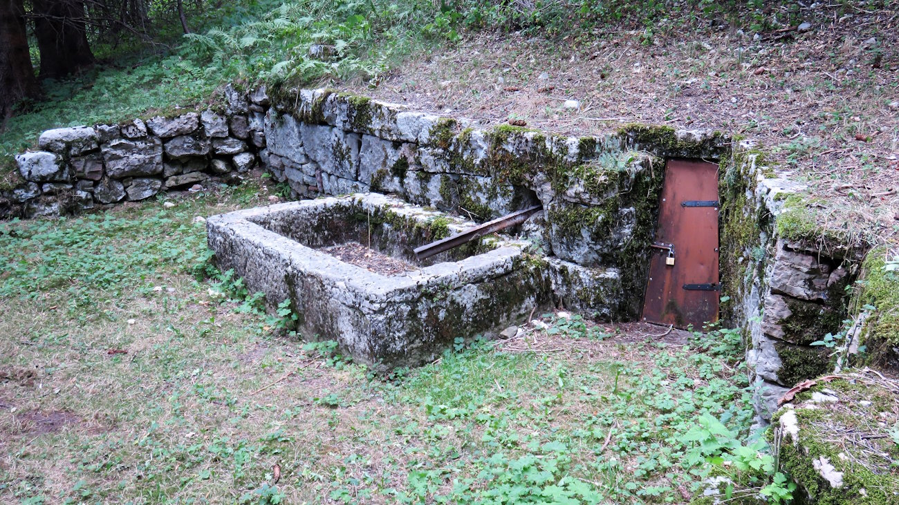 Più avanti la discesa si fa più marcata e la traccia entra nel bosco. Cerco di rallentare ancora il passo perché penso sia proprio un peccato concludere questo bel giro. Entro dopo poco di nuovo sotto le chiome degli alberi dove il terreno diventa gradinato e inizia a scendere ad ampi tornanti. Dopo uno di questi, ecco una vera (ex) fontana, quella di Contrà Pettinà. Oggi è rimasta solo la vasca di raccolta e non scende acqua. Peccato.