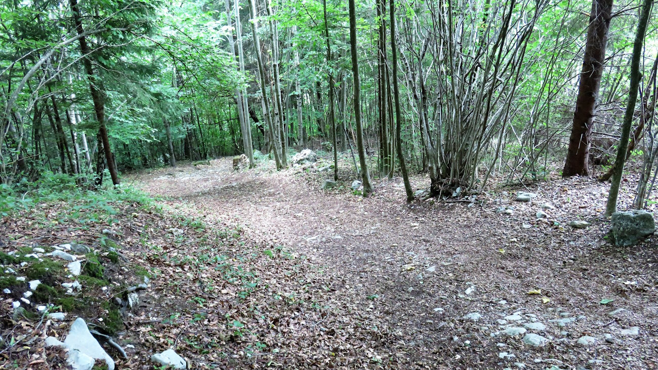 Mi alzo a fatica da questa comoda panchina: in un posto così idilliaco dovrei passarci la giornata, magari leggendo un buon libro. Seguendo le masiere che una volta delimitavano i confini dei pascoli arrivo ad un altro bivio, in una piccola radura. Il mio cammino ora mi porta a sinistra, verso il completamento di questo percorso (a destra proseguirei lungo il Sentiero Excalibur).