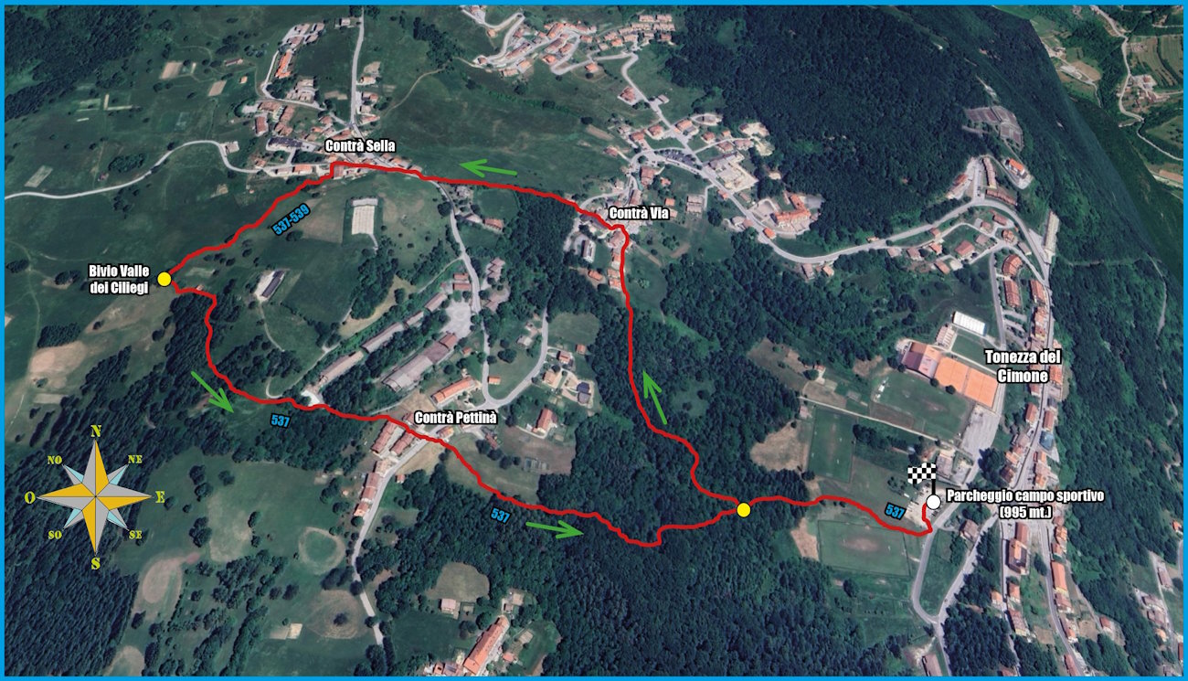 Tappe del percorso: Parcheggio campo sportivo di Tonezza - Bivio per n° 537 (Sentiero delle Fontanelle) - Contrà Via - Contrà Sella - Bivio Valle dei Ciliegi - Contrà Pettinà - Bivio per n° 537 (Sentiero delle Fontanelle) - Parcheggio campo sportivo di Tonezza